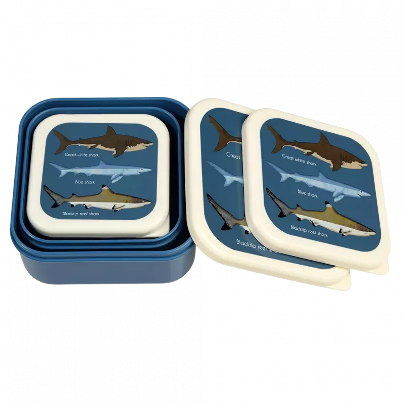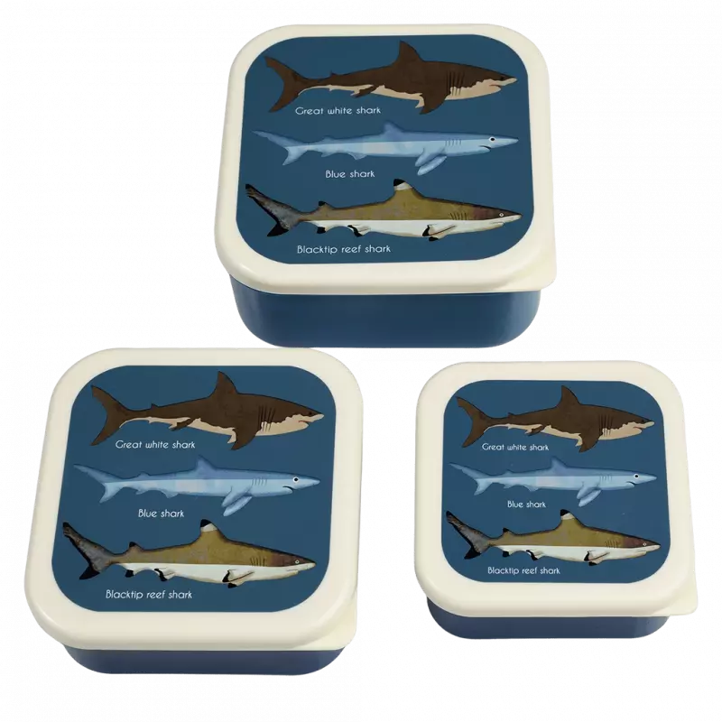 Perfect for lunch boxes or days out, this cool set of Sharks snack boxes has three different sizes, ideal for storing a range of snacks, from fruit and crackers, to cheese and small sandwiches. The nesting design makes for easy and compact storage when not in use.